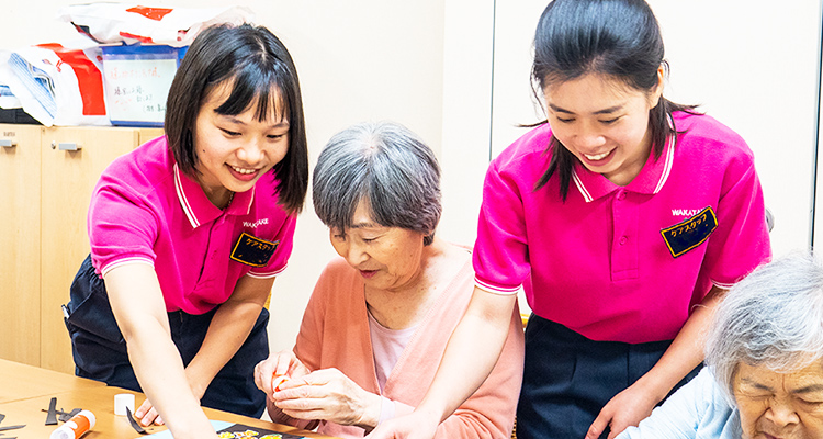 若竹大寿会では、スタッフファーストを掲げており、スタッフのチームワーク、コミュニケーションをとても大切にしています。気軽に質問したり提案が受け入れられる風土があります。幅広い年代のスタッフが活躍しており、活気にあふれています。